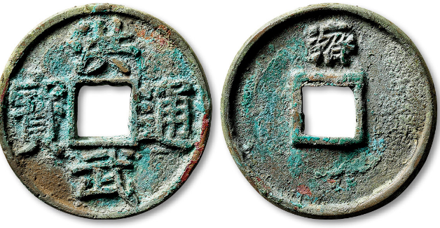 明 洪武通宝折五背京。 直径39.9×2.6mm 重15g