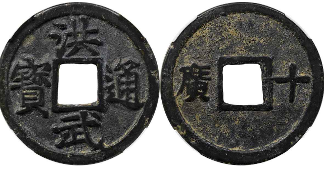 明 洪武通宝 十福。GBCA 美90 1112857202。明洪武通宝十福一枚,45.6*3.6mm,26.1g。文字清晰,绿绣苍翠,上美品。