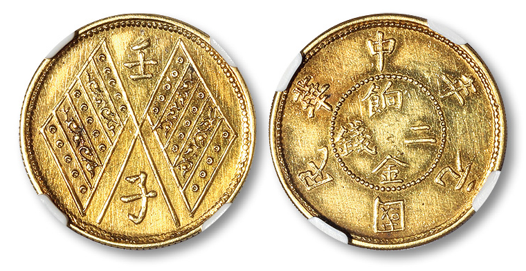 1901年江苏省造光绪元宝黄铜样币,每元当钱二文,KM-PN2, NGC MS 63,席德柄/张南琛收藏虽然该币品相不算拔尖,该品种样币很受欢迎。。