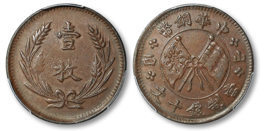 编号名称评级情况价格(CNY)4088山西中华铜币十文直条旗PCGS MS 642074.08(288USD,汇率按 7.2 估算)2515山西中华铜币十文星条旗PCGS MS 63BN1093.56……